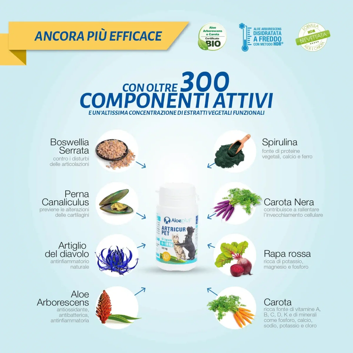 Artricur Pet รจ un alimento complementare di alta qualitร , formulato per preservare la salute e la flessibilitร articolare di cani e gatti in ogni fase della vita. Grazie a unโinnovativa sinergia di estratti fitoterapici, questo integratore agisce in modo profondo e naturale per sostenere lo sviluppo articolare nei cuccioli, supportare la mobilitร negli anziani e proteggere le articolazioni dei soggetti sportivi sottoposti a sforzi intensi. La sua efficacia รจ garantita dalla formulazione sinergica di oltre 300 componenti attivi, che lavorano insieme per massimizzare il benessere dell’apparato muscolo-scheletrico.
