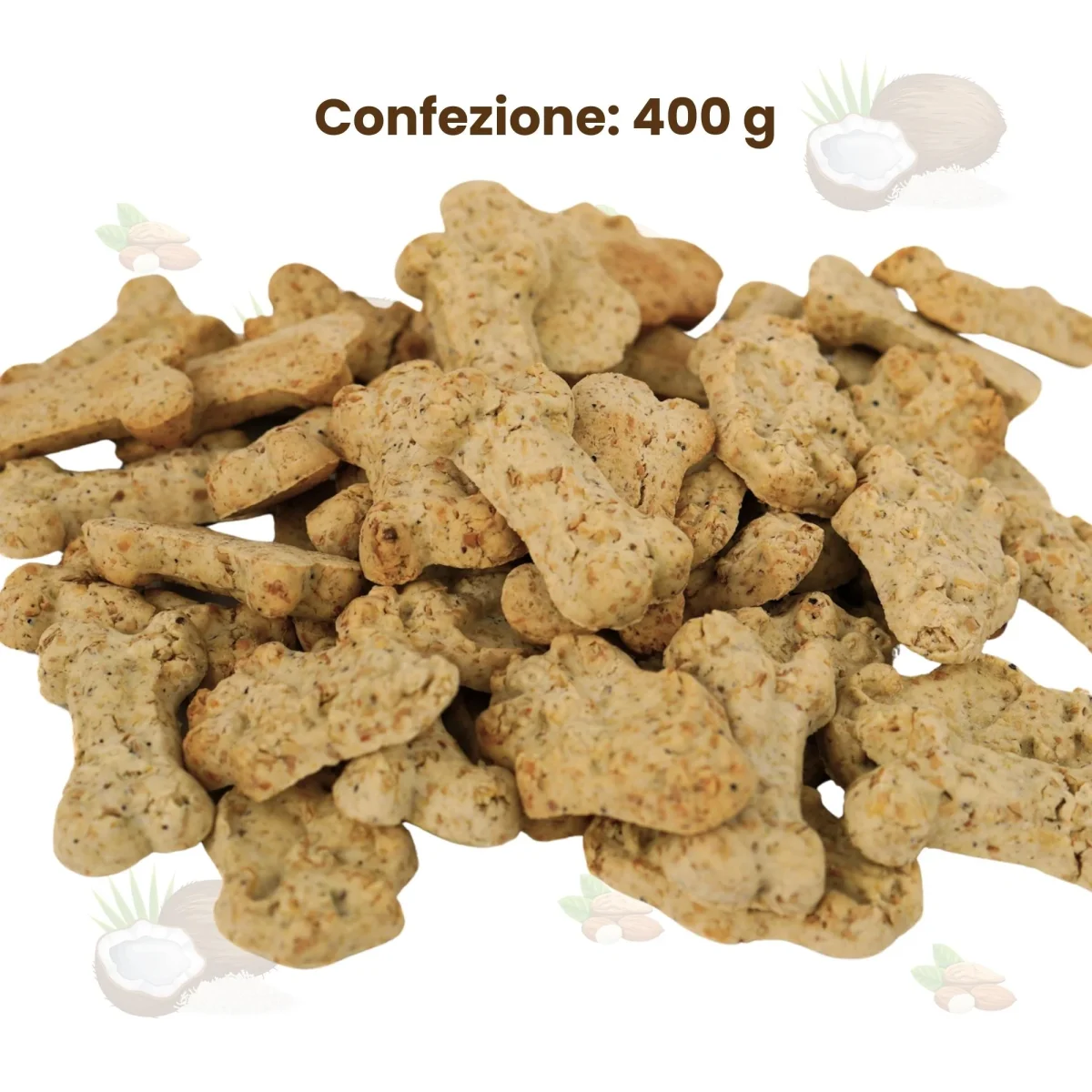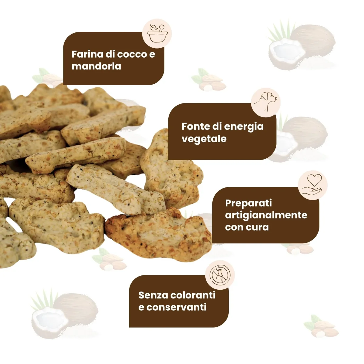 Biscotti artigianali con cocco e mandorle, ideali per coccolare il tuo cane con uno snack goloso e naturale.