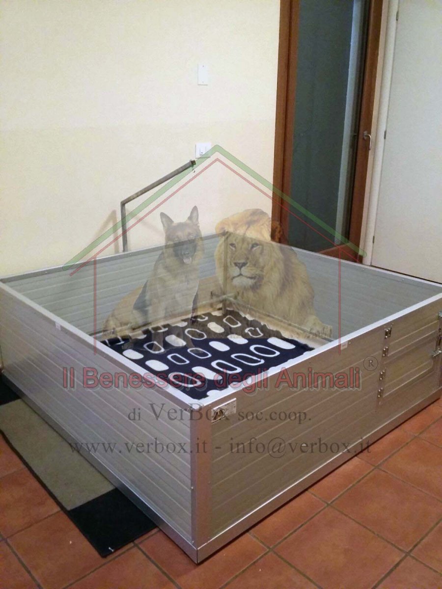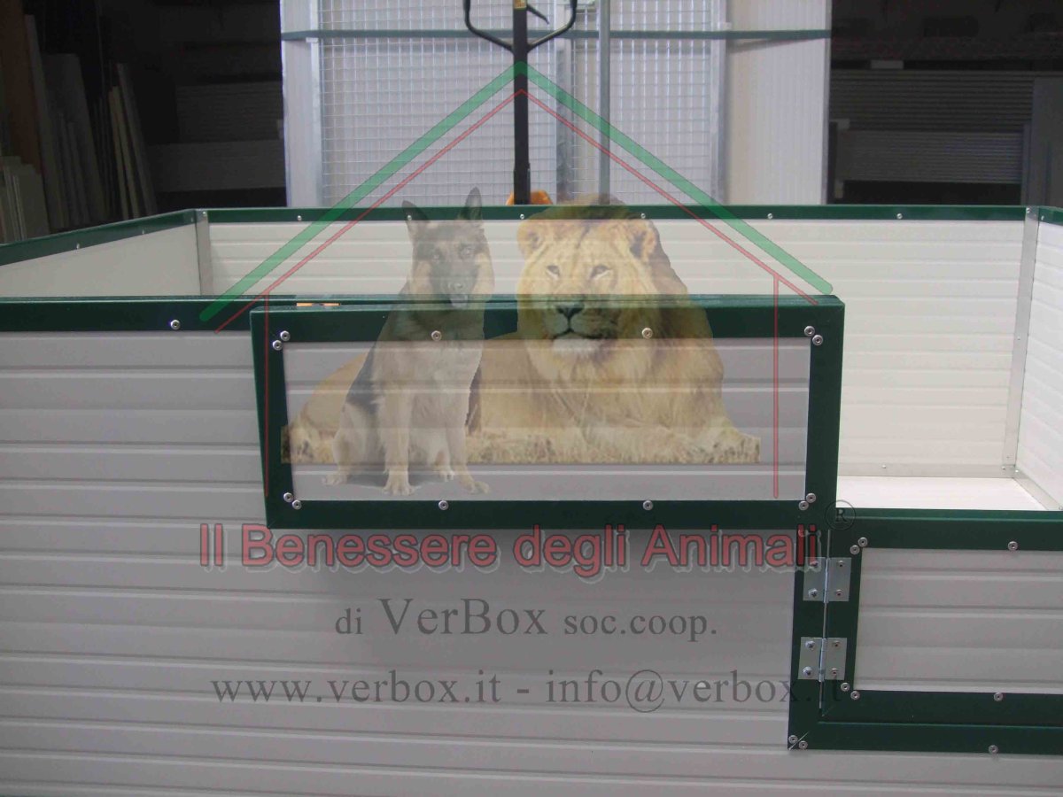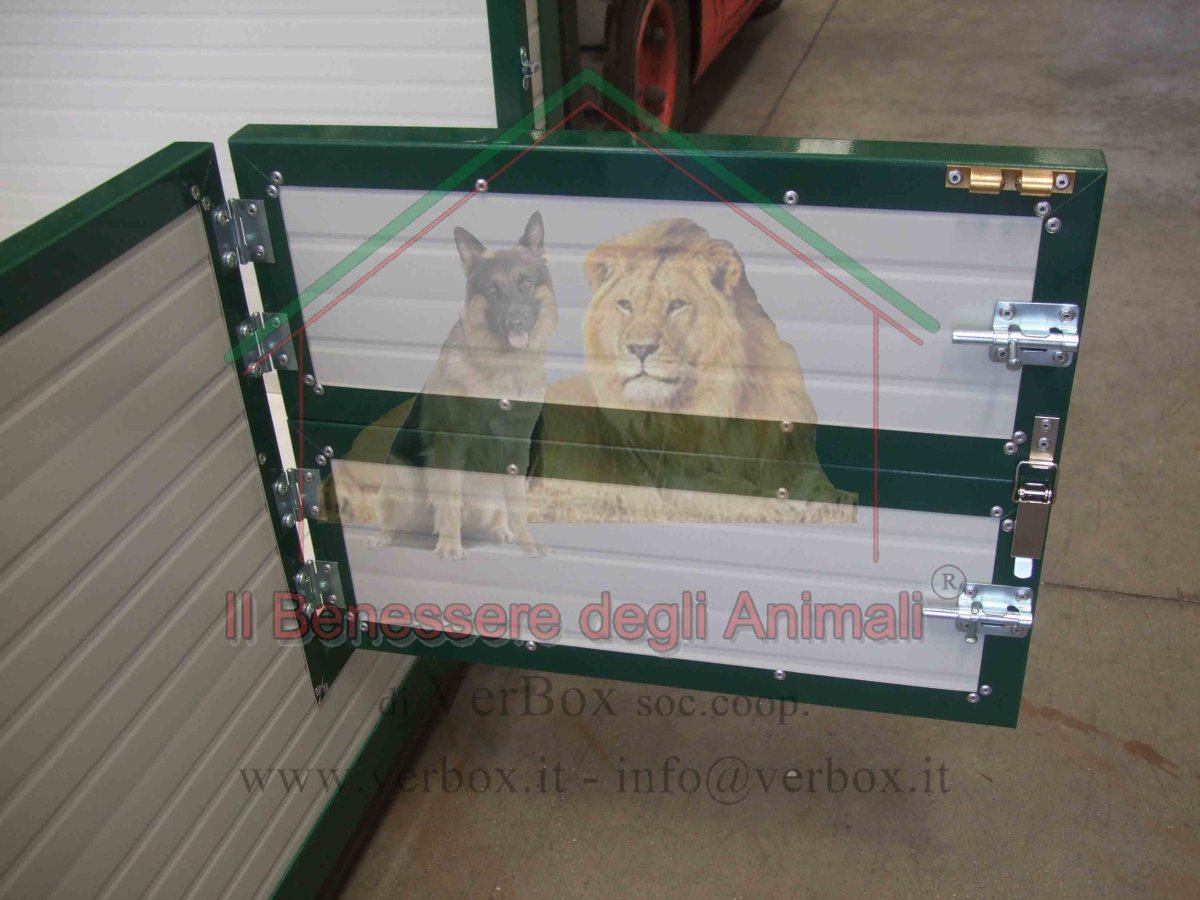 Verbox propone la cassa parto con un ingresso protetto da doppio sportello INCERNIERATO lateralmente che consente di aprirne uno o entrambi e gestire così la crescita dei cuccioli.