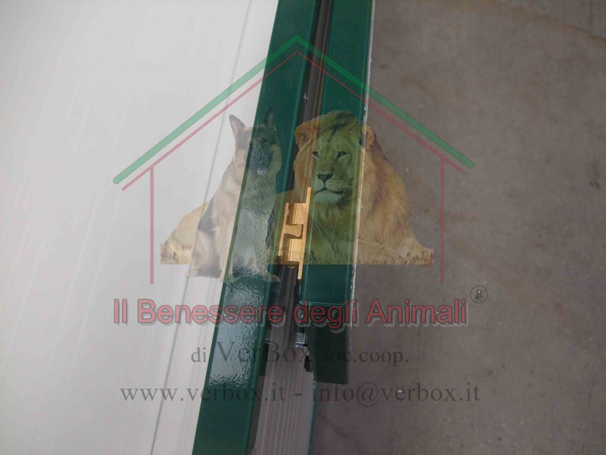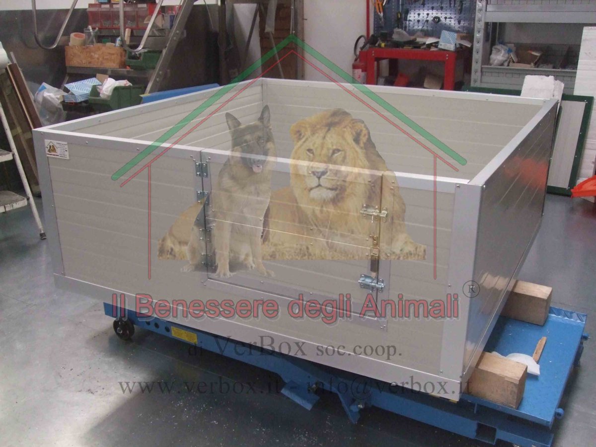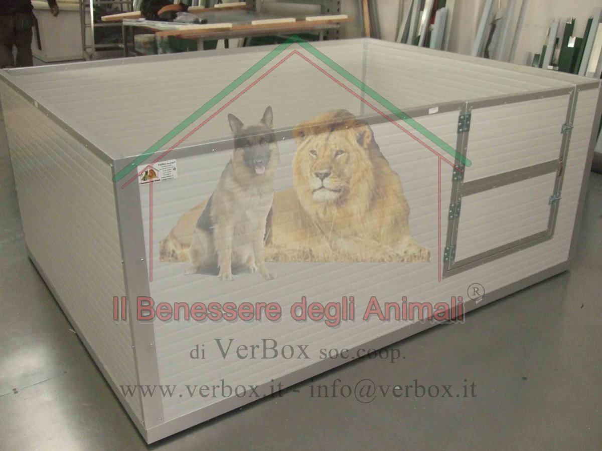 Verbox propone la cassa parto con un ingresso protetto da doppio sportello INCERNIERATO lateralmente che consente di aprirne uno o entrambi e gestire così la crescita dei cuccioli.