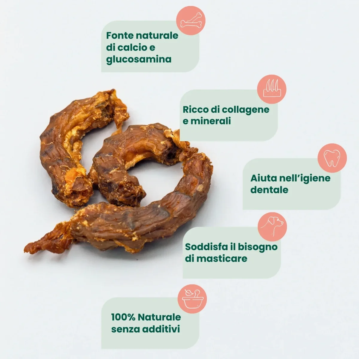 I colli di pollo essiccati sono uno snack naturale e croccante, ideale per soddisfare il bisogno di masticare. Ricchi di calcio, fosforo e glucosamina, supportano la salute di ossa, articolazioni e denti. Friabili e facili da masticare, sono perfetti anche per cani alle prime esperienze.