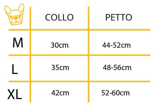 Nelle foto, il gatto indossa la M, il barboncino la L e il bouledogue francese la XL