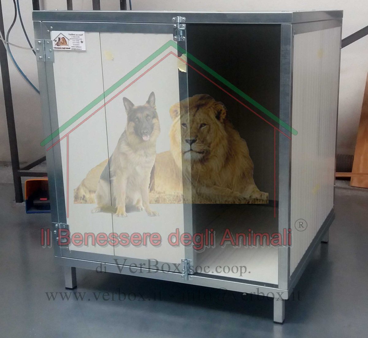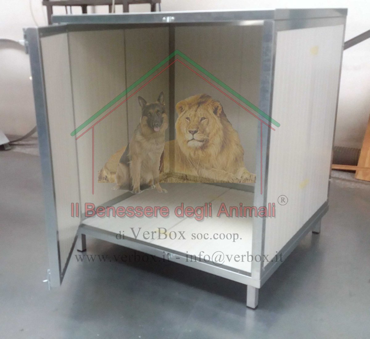 Cucce coibentate con varco, il modello più economico fra le cucce Verbox, ideali per spazi interni a box o per zone coperte, essendo il tetto a filo e privo di spiovenza.