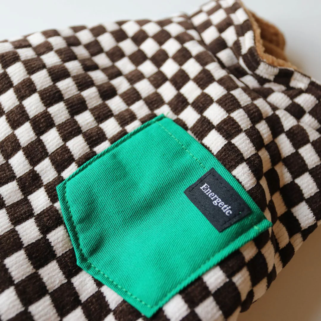È double-face: da un lato il motivo a scacchiera, dall’altro un lato più semplice e morbido.