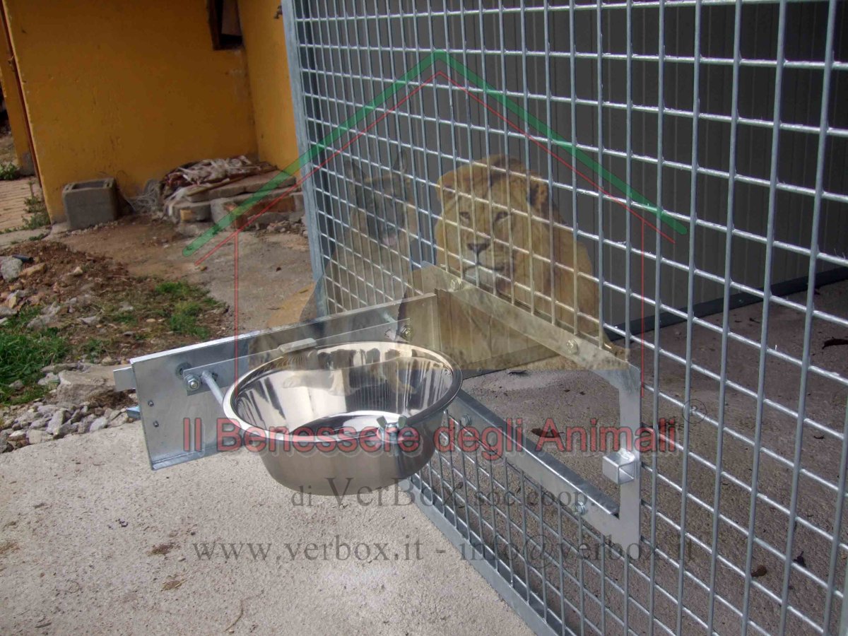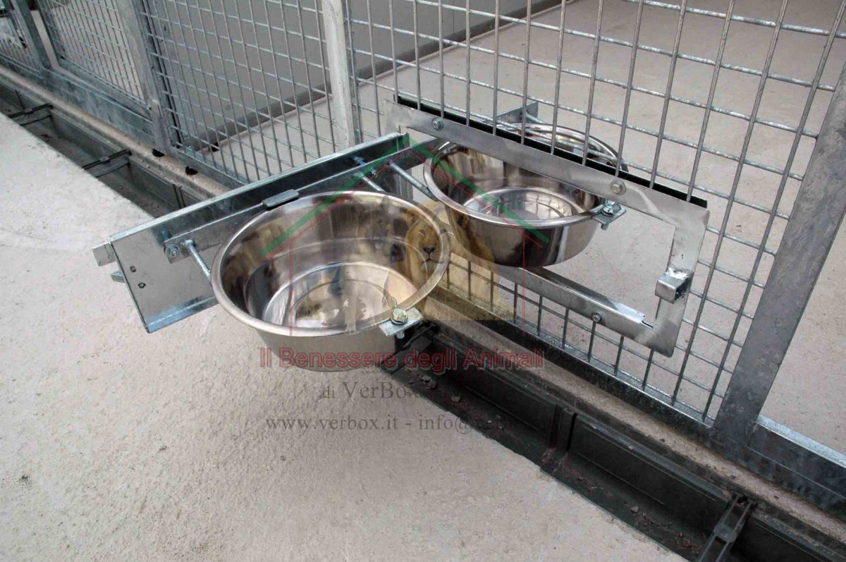 GIRO-CIOTOLA DOPPIO oppure SINGOLO generalmente installato per ciascun box, con sistema antiribaltamento, tutto zincato a caldo. Formato da n.1 piastra girevole con alloggiamento per n.1 ciotola oppure n.2 ciotole diametro 25cm e cornice di rifinitura da fissare sul pannello coibentato del retro notte del box. N.1 oppure n.2 Ciotole in acciaio inox diametro 25cm escluse.