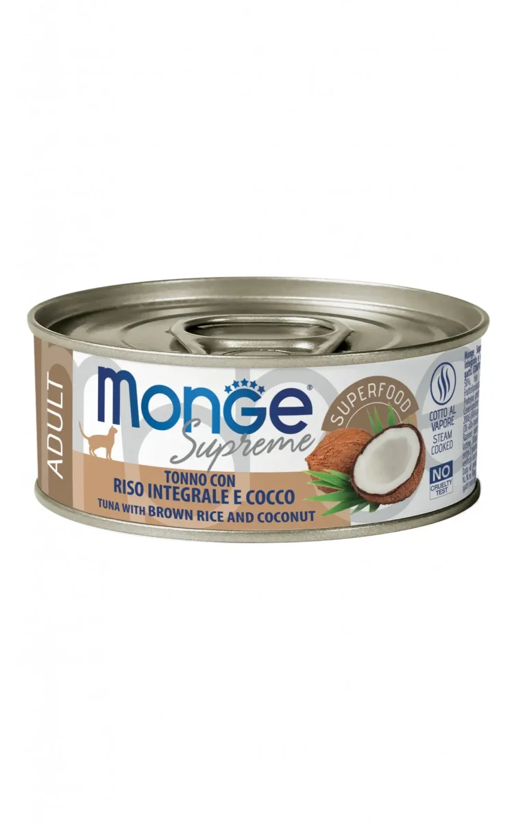 MONGE SUPREME GATTO ADULTO TONNO CON RISO INTEGRALE E COCCO è un alimento bilanciato per gatti adulti.