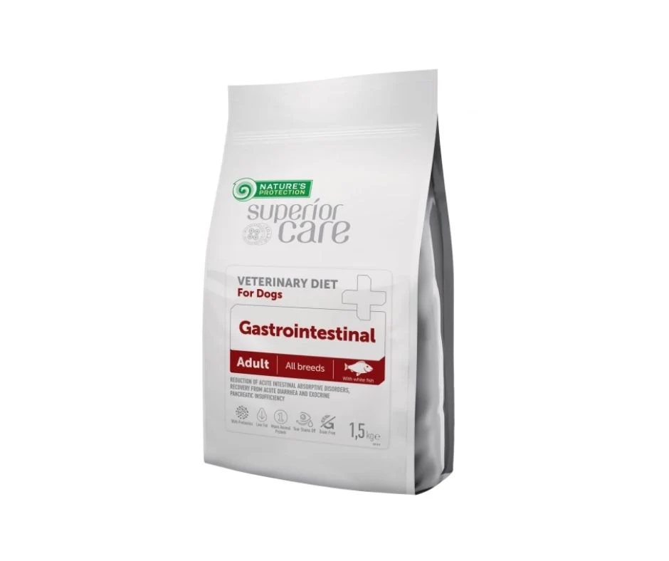 NATURE’S PROTECTION SUPERIOR CARE VETERINARY DIET Gastrointestinal per cani adulti di tutte le razze con pesce bianco è un alimento secco per cani completo e ben bilanciato Super Premium appositamente formulato per soddisfare le specifiche esigenze di salute dei cani con determinate condizioni mediche. Questi tipi di alimenti forniscono alla dieta veterinaria un efficiente equilibrio di nutrienti e supportano la salute e il benessere dell’animale. La composizione di questo prodotto è formulata per lenire il tratto digestivo, favorire una sana digestione e controllare sintomi come problemi digestivi, diarrea cronica o vomito.