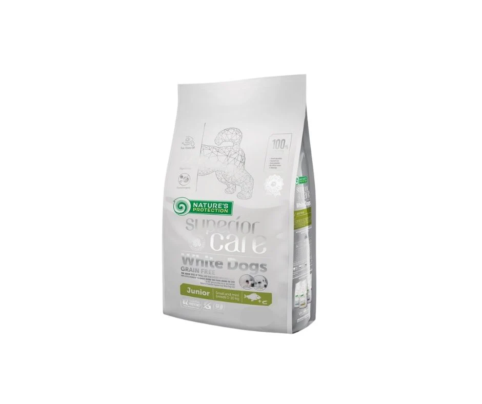 Le crocchette per cani cuccioli con pelo bianco Nature’s Protection Superior Care White Dogs Grain Free Pesce Bianco Junior All Breeds sono un alimento innovativo specificatamente formulato per aiutare a rimuovere le macchie marroni intorno agli occhi, alla bocca e alle zampe che appaiono a causa di lacrime e saliva.