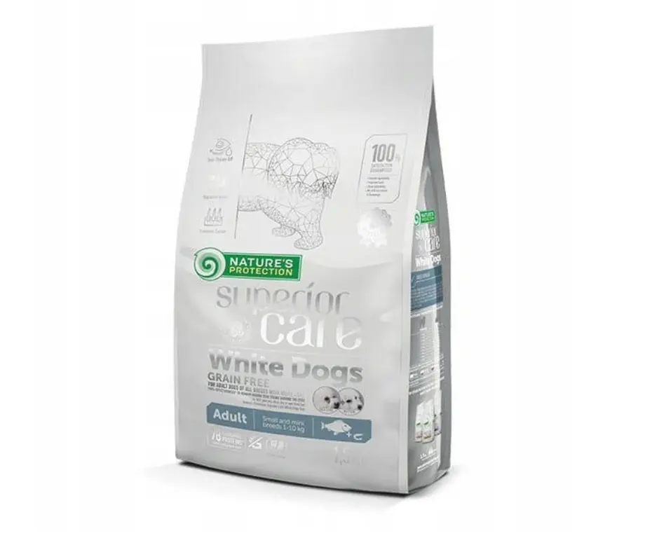 Le crocchette per cani con pelo bianco Nature’s Protection Superior Care White Dogs Grain Free Pesce Bianco All Breeds sono un alimento innovativo specificatamente formulato per aiutare a rimuovere le macchie marroni intorno agli occhi, alla bocca e alle zampe che appaiono a causa di lacrime e saliva.