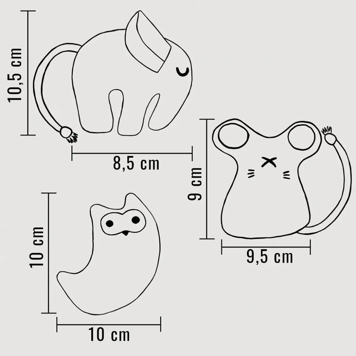 โข 3 giocattoli (Elefante, Topo, Gufo)
