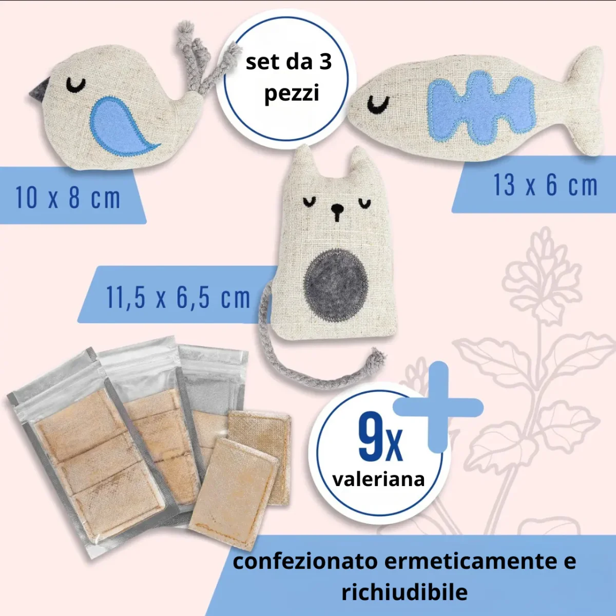 – Set da 3 pezzi โข con sacchetti di erba gatta โข in lino e cotone
