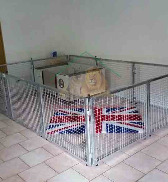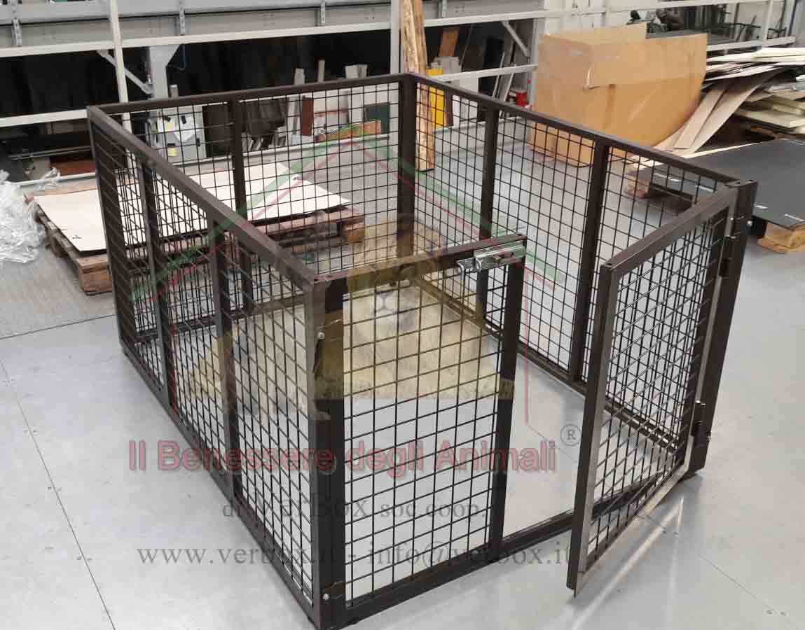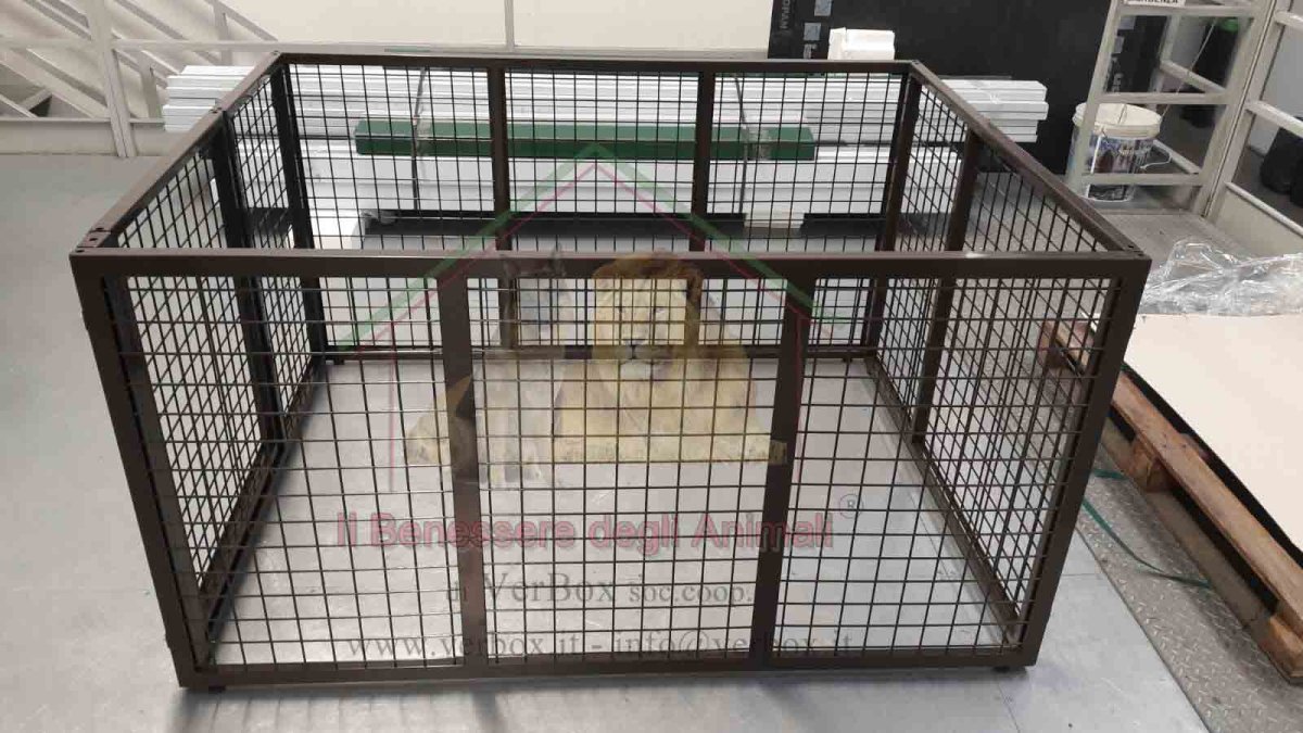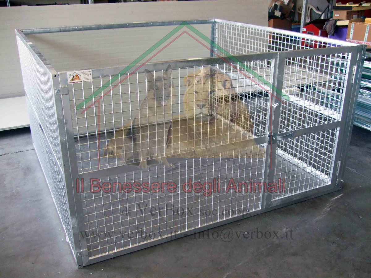 Recinto componibile per cani in tubolare serramenti e rete elettrosaldata 40x40x4, zincato a caldo. Ideale sia per uso interno che esterno. piedini regolabili in altezza 0.5/2.2cm, per non toccare e graffia il pavimento pannelli accoppiabili mediante aste filettate con pomello superiore componibile, facilmente montabile e smontabile e accatastabile in poco spazio Dimensione pannelli: L100xH80cm Sono possibili su richiesta dimensioni diverse